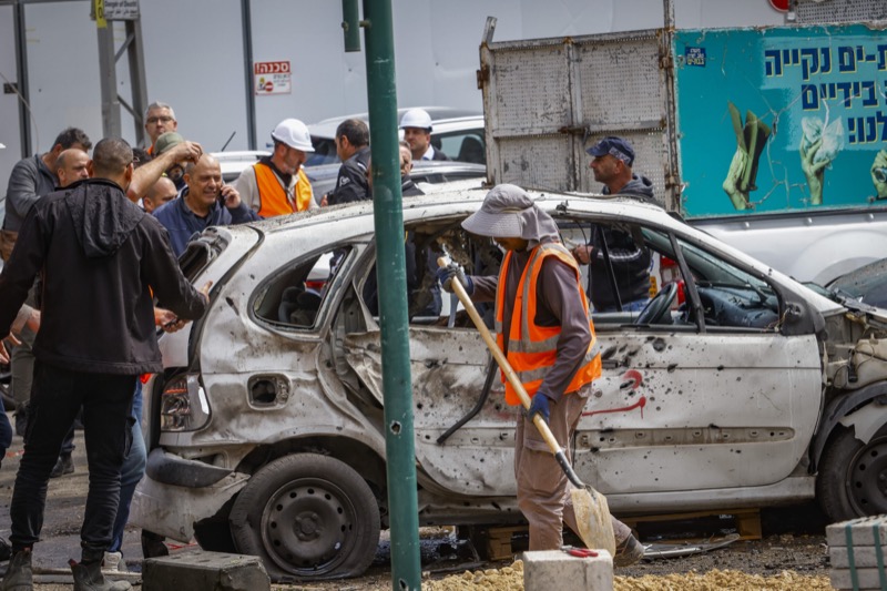 Cluster munition fired by Iranian regime spreads damage over Greater Tel Aviv area, catching two construction workers off-guard.