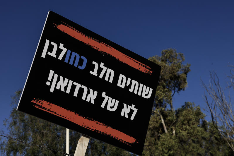 “We drink ‘blue-and-white’ milk, not the milk of Erdogan!” – a reference to the fact that Israel might have to import dairy from potentially hostile sources if the reforms go through. “Protecting Israeli milk” – protesters in the Western Negev. Photo by Tsafrir Abayov/FLASH90