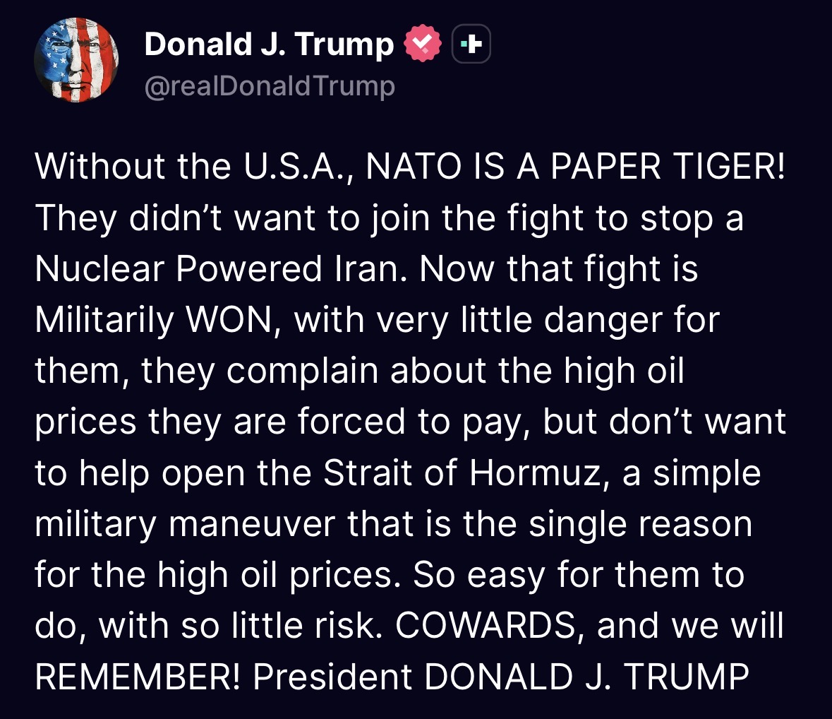 The UK last Friday did permit American forces to use British bases to strike Iranian forces threatening the Strait of Hormuz, but Trump said that approval had come much later than it should have.