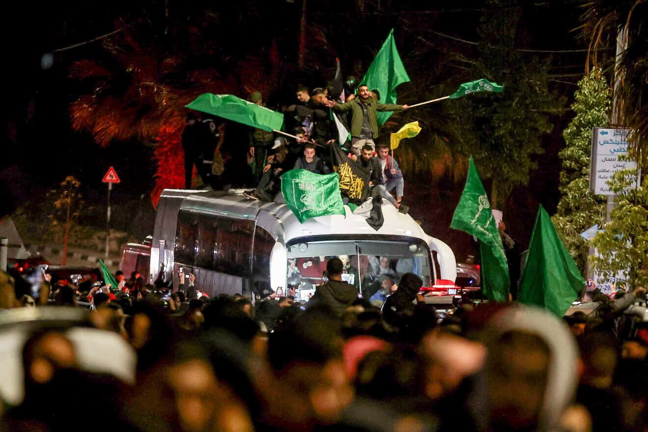 Palestinian terrorists released in a hostage exchange between Israel and Hamas are welcomed in Beitunia near Ramallah on January 20, 2025. Photo: Flash90.