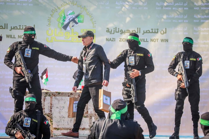 Hamas terrorists hand over Israeli hostage Keith Siegel to the Red Cross during a propaganda ceremony in Gaza City, February 1, 2025. Photo: Ali Hassan/Flash90.