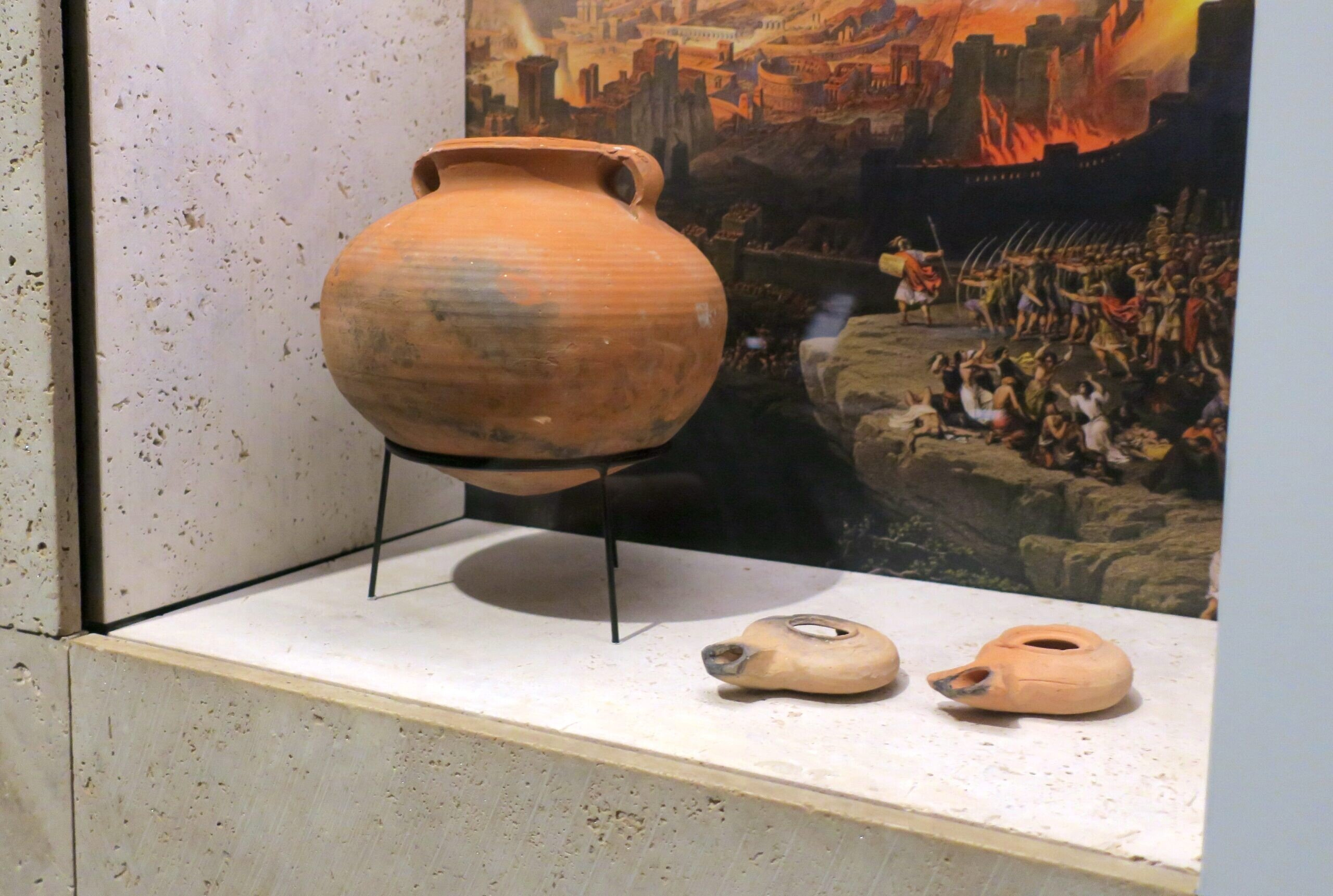 (JNS) At first blush, a vitrine in a new Museum of the Bible exhibition in Washington seems unremarkable. An earthy orange jug with handles overlooks two small oil lamps, all set before a reproduction of part of David Roberts’s c. 1850 painting of Titus commanding the siege and destruction of Jerusalem in 70 CE.