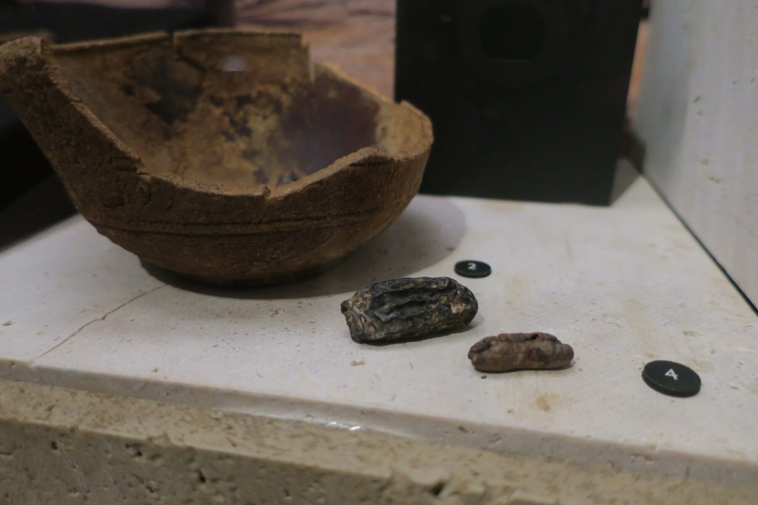 Dried date and pit alongside wooden bowl from a local tree, Qumran, Roman period, on view in a Dead Sea Scrolls exhibit at the Museum of the Bible in Washington, DC, on Nov. 21, 2025. Photo by Menachem Wecker.