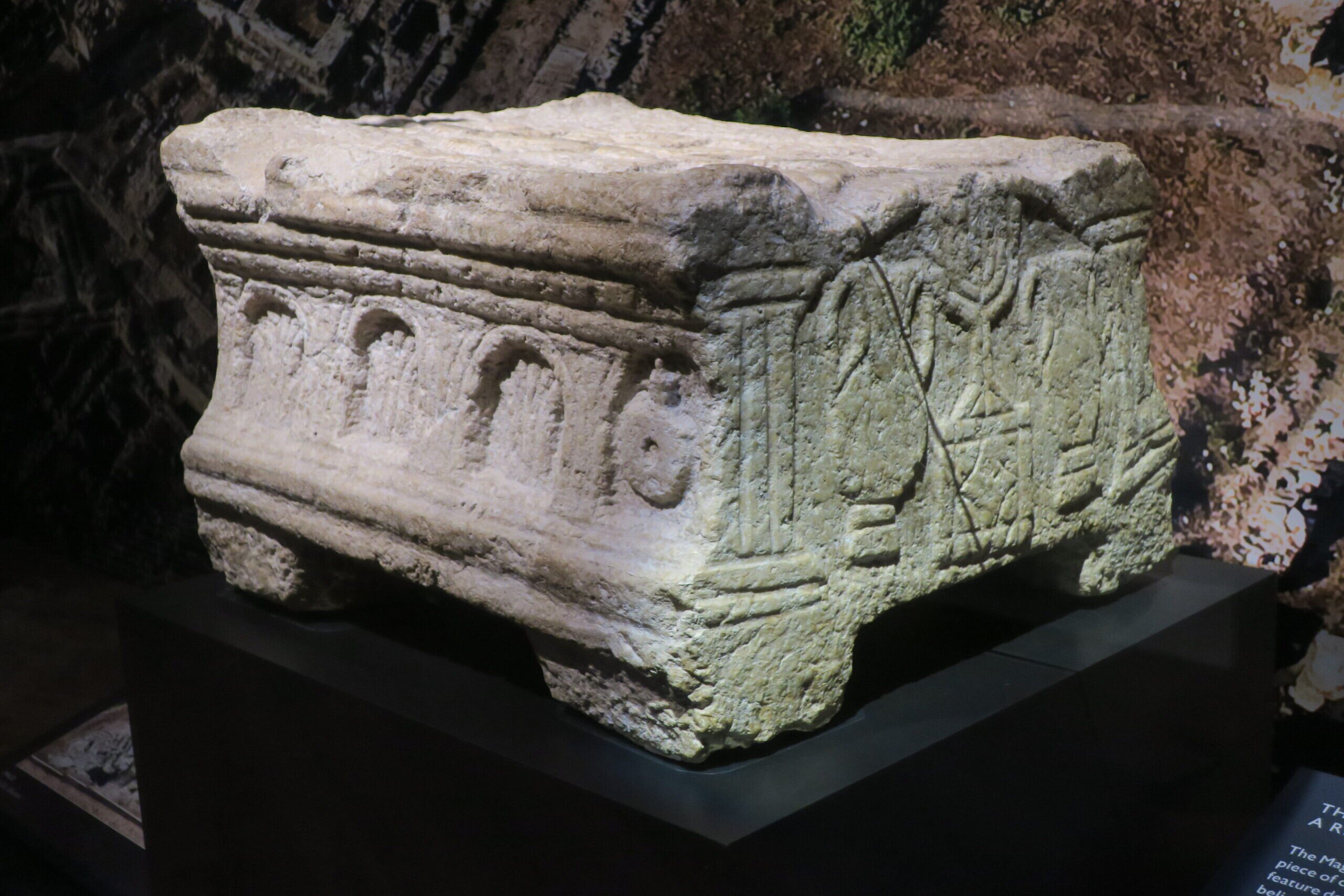 The stone also depicts other vessels, arches, and rosettes, or rose-shaped designs that often appear as Jewish symbols.