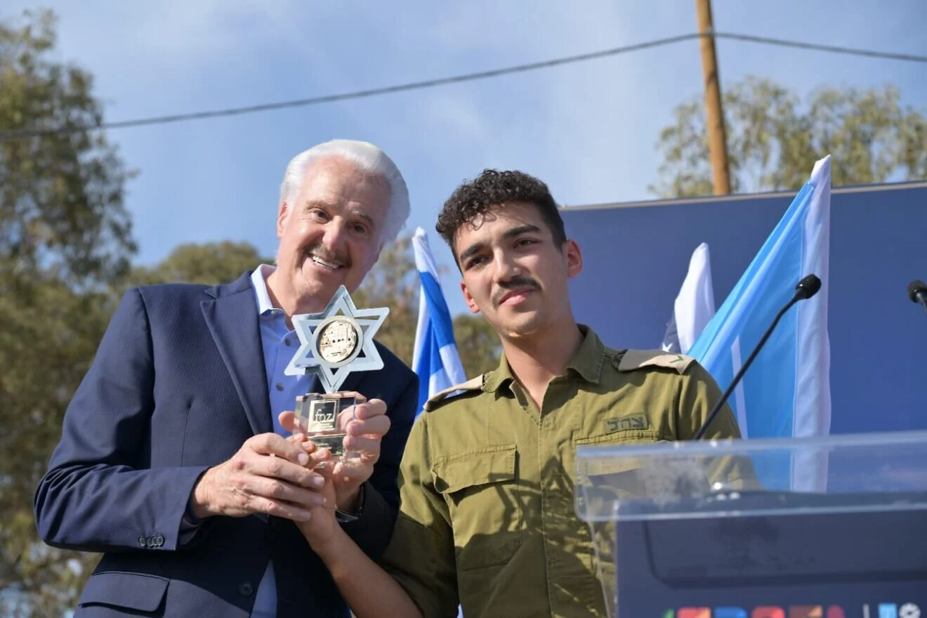 Dr. Mike Evans presents an award to freed hostage Edan Alexander, back in IDF uniform, near the Gaza border on Dec. 3, 2025. Photo by Yossi Zamir.