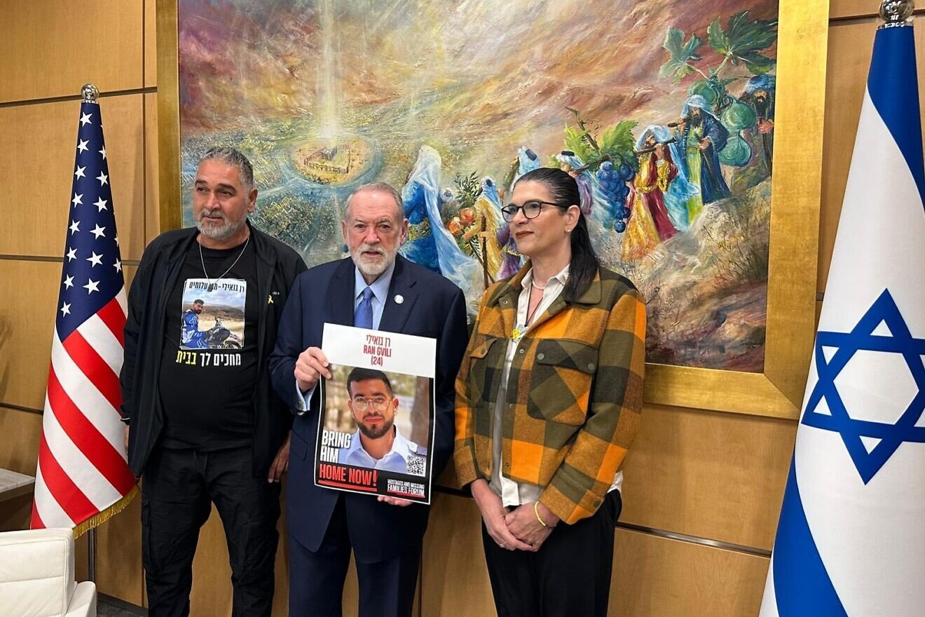 Talik and Itzik Gvili met US Ambassador to Israel Mike Huckabee at the U.S. embassy in Jerusalem, Nov. 28, 2025. The Gvilis’ son Ran was taken captive by terrorists on Oct. 7, 2023, and is the last Israeli hostage being held in Gaza. Credit: The Hostages and Missing Families Forum.