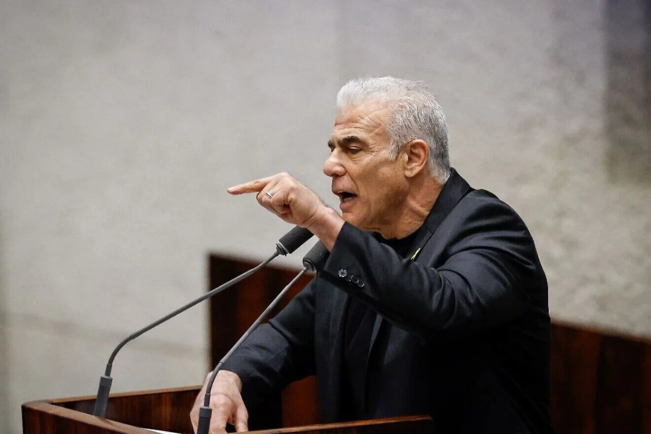 Opposition Leader Yair Lapid of the Yesh Atid Party during the preliminary reading of a bill to establish a “special state commission of inquiry” into the events of Oct. 7, 2023, in the Knesset, Dec. 24, 2025. Credit: Knesset website.