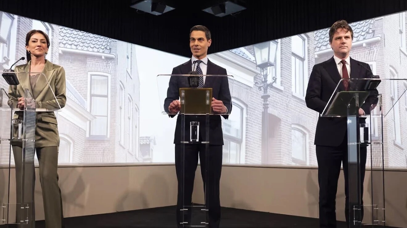 D66 leader Rob Jetten (center) Dilan Yeşilgöz and Christian Democratic Appeal head Henri Bontenbal present the coalition agreement of the Dutch government in The Hague, the Netherlands on Feb. 1, 2026. Photo by Aan de Slag.