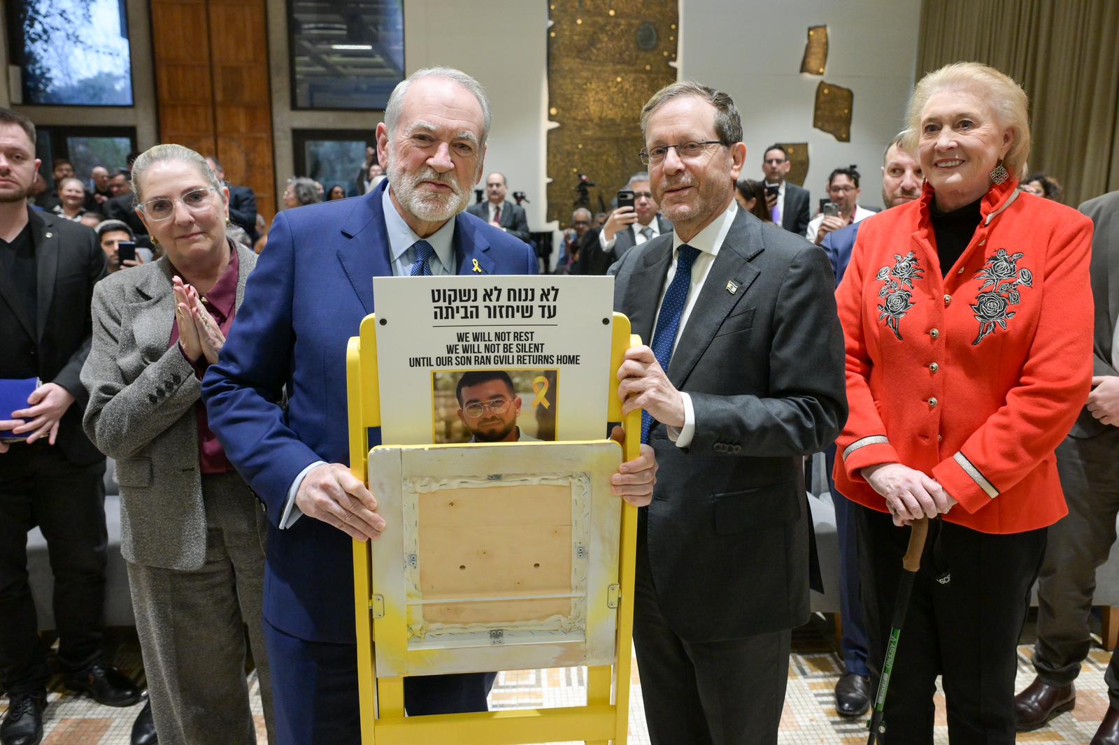 Also speaking at the event was US Ambassador Mike Huckabee, who noted the “extraordinary privilege” of finally removing the yellow hostages’ pin he, like so many others, had been wearing on his lapel for the past two years.