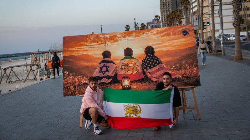 An artwork depicting the flags of Israel and the United States alongside the lion and sun emblem associated with the Iranian opposition is displayed along the beach promenade in Tel Aviv, March 11, 2026. Photo by Chaim Goldberg/Flash90