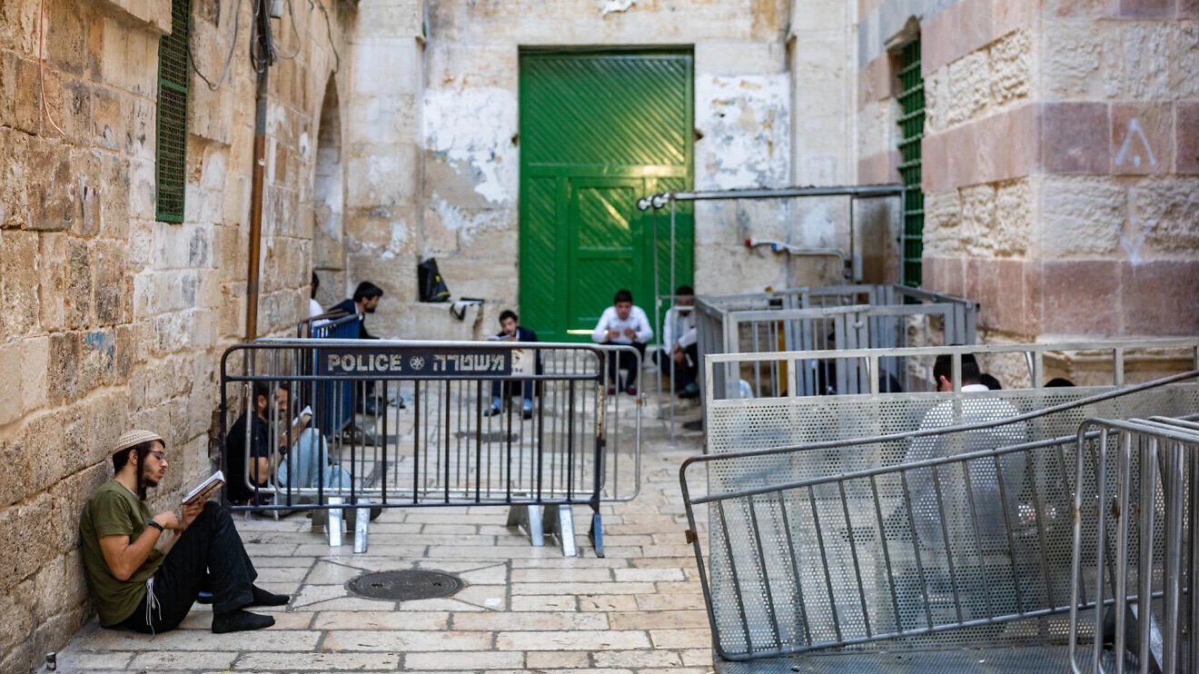 Jewish men pray at the entrance to the Temple Mount in Jerusalem’s Old City during Tisha B’Av, Aug. 3, 2025. Photo by Chaim Goldberg/Flash90.