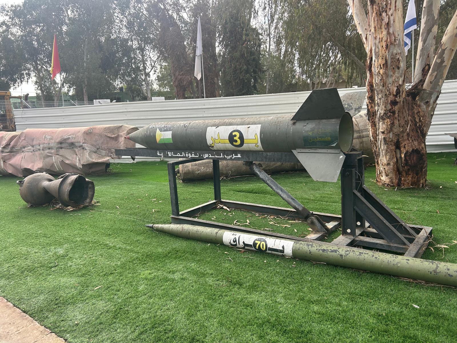 As visitors approach the barracks where the weapons are stored, remnants of Iranian missiles used to target Israel at various times come into view. Nearby stands a mock Badr-3 surface-to-surface missile that was used as a propaganda prop during Hamas parades in Gaza. The terrorists typically store such weapons beneath civilian homes or in facilities built to deceptively resemble residential structures.