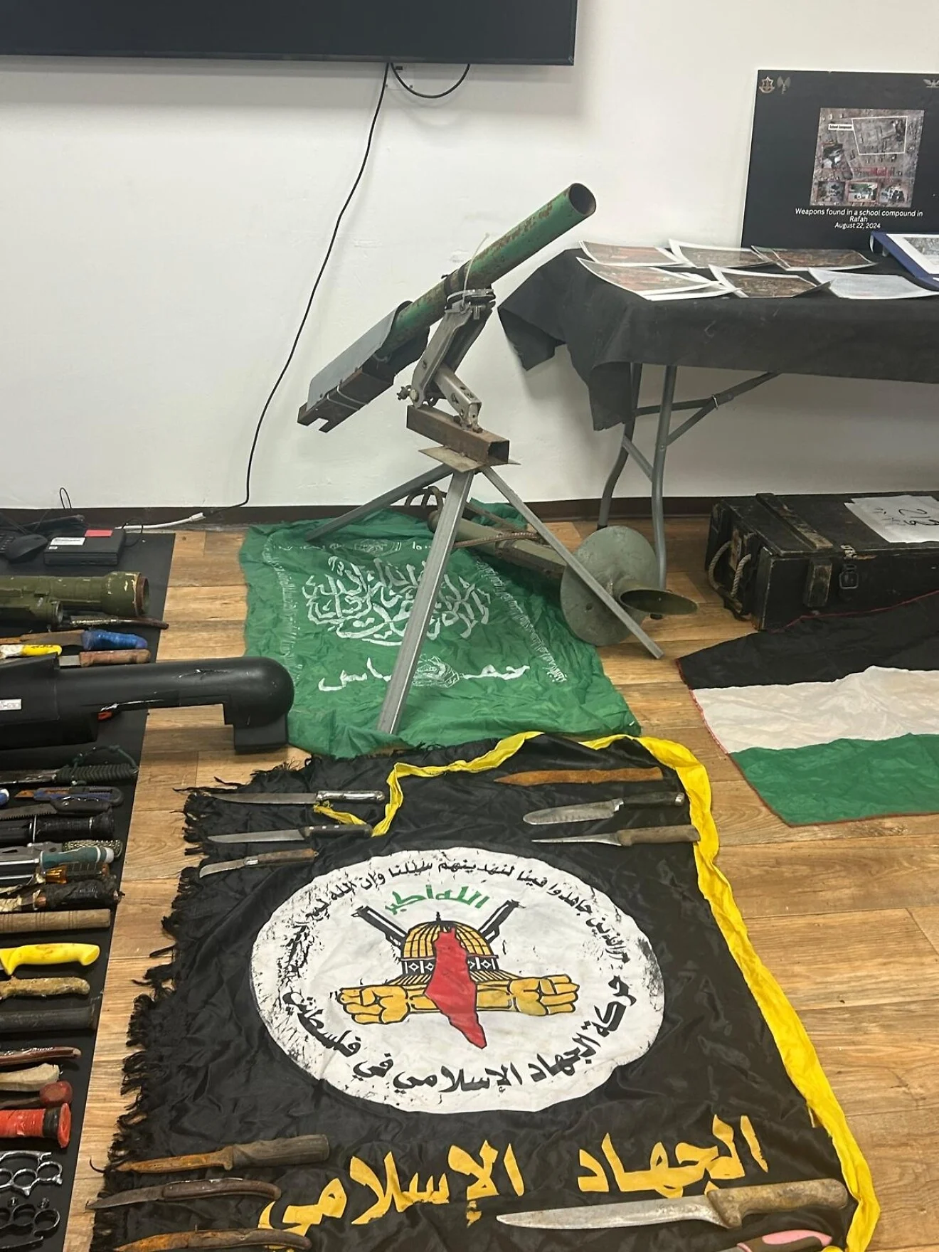 Toward the center of the room, various types of knives are laid out. “Anything with a blade was part of the terrorists’ equipment on Oct. 7. Every terrorist whose body we found was carrying at least one blade. You can see kitchen knives, butcher knives, axes, homemade knives, commando knives and sharpened screwdrivers,” he said.