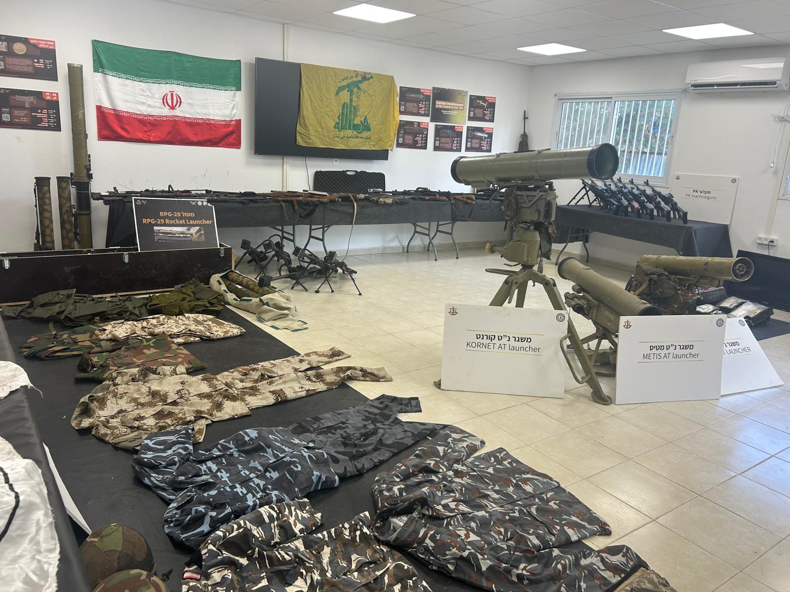 To the left, an RPG-29 is displayed in its case with operating instructions. Nearby are bags containing various types of military vests recovered from areas Hezbollah had prepared in advance of a planned breach into Israel.