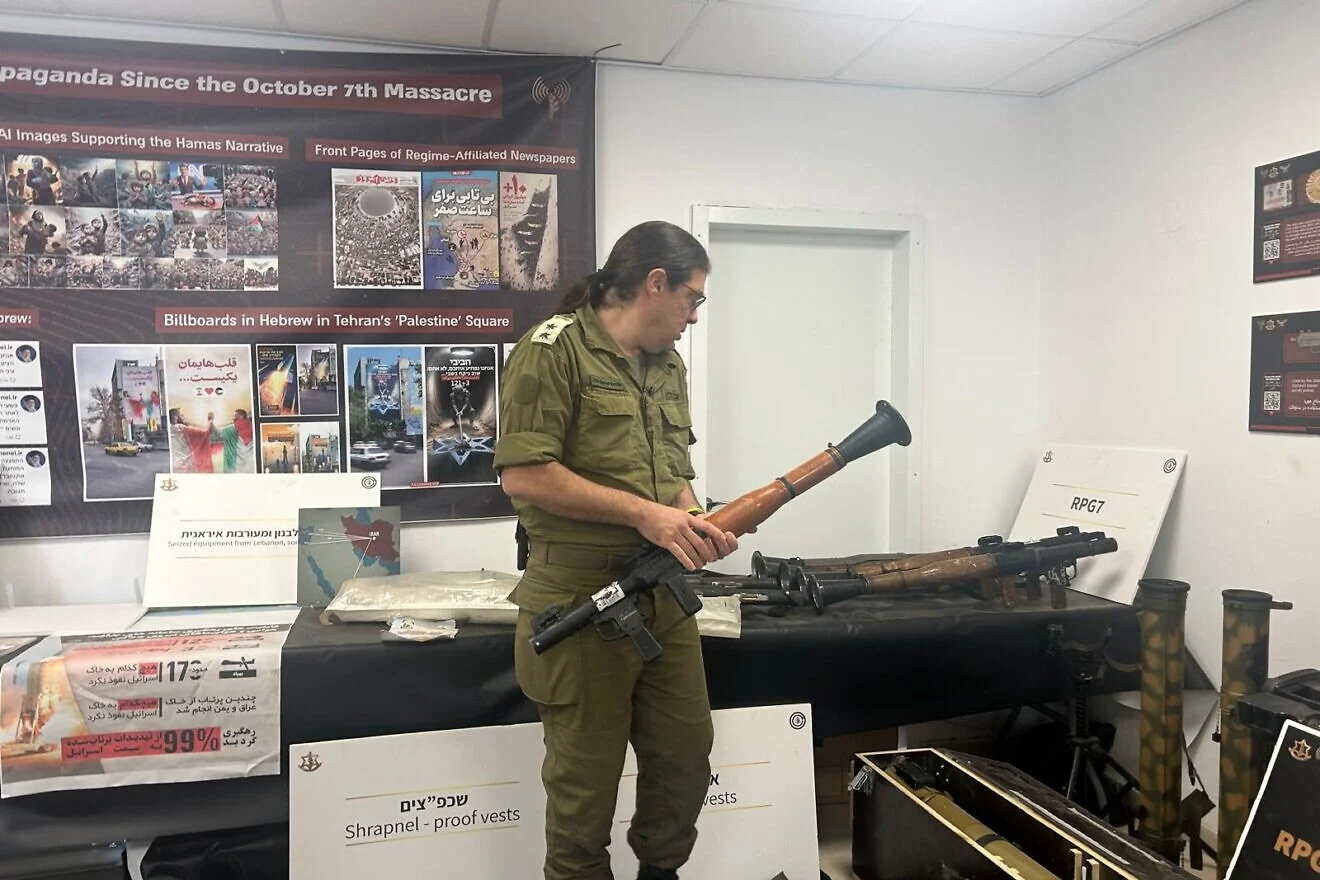 IDF Lt. Col. (res.) Idan Sharon-Kettler holds a Hezbollah RPG-7 shoulder-launched anti-tank grenade launcher at Tzrifin Camp, December 2025. Photo by Amelie Botbol.