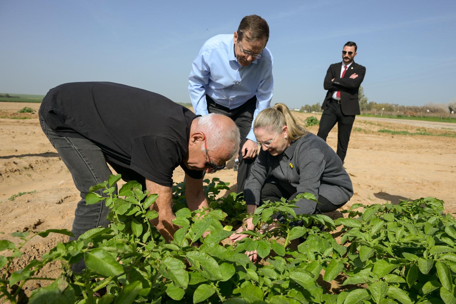 From there the tour continued to the center of Gadi Mozes’ work—the potato fields. On the fields from which the kibbutz farmers make their living and which have shaped its character for decades, the President and his wife paused together with Mozes and listened to explanations about the return to agricultural work. A daily struggle to sow and harvest again—even though the soil still bears the marks of battle. The field for whose renewed cultivation Mozes fought after his return from captivity has become a symbol.