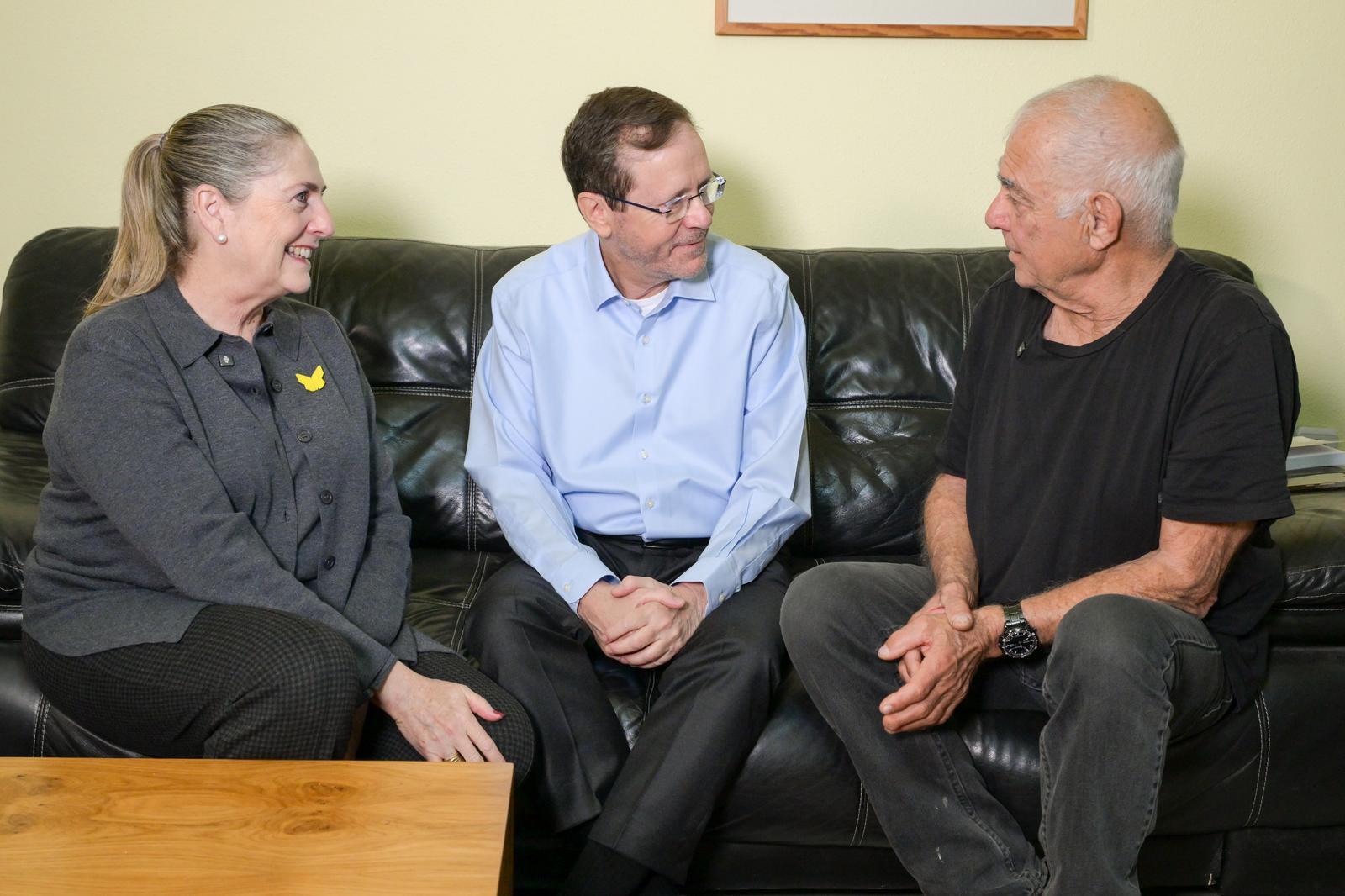 President Isaac Herzog and his wife visited the destroyed kibbutz together with Gadi Mozes—who returned to Israel a year ago after 482 days in Hamas captivity and has since tirelessly fought for the kibbutz’s reconstruction.