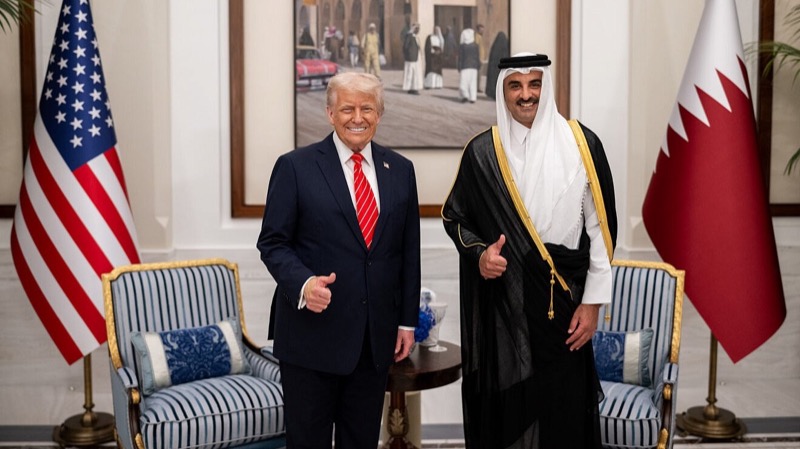 US President Donald Trump poses for a photo with the Emir of Qatar, Sheikh Tamim bin Hamad Al Thani, before an official state banquet at the Lusail Palace in Doha, Qatar, on May 14, 2025. Photo: Daniel Torok/White House.