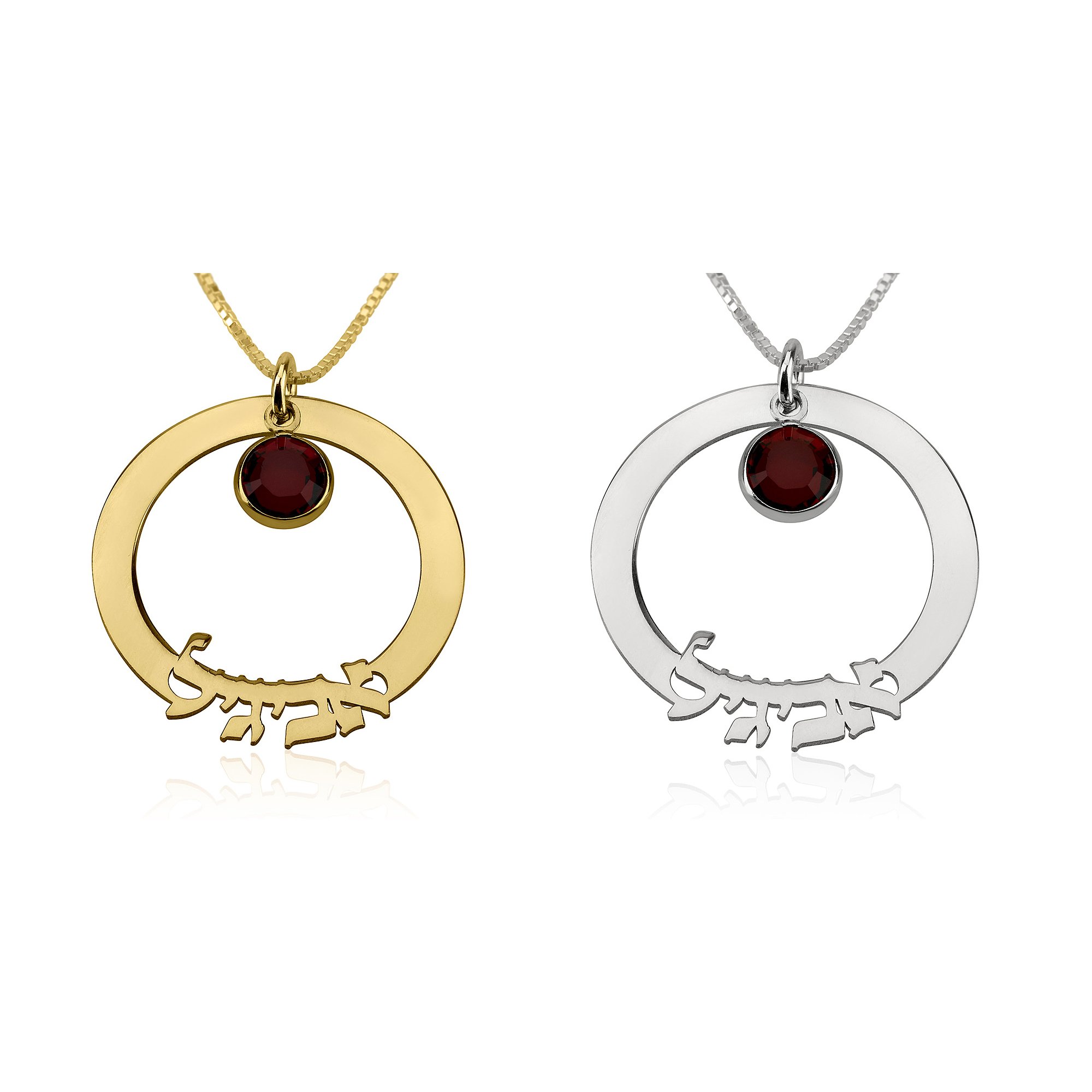 Beautiful, circular pendant with a Swarovski crystal and your desired Name in Hebrew.